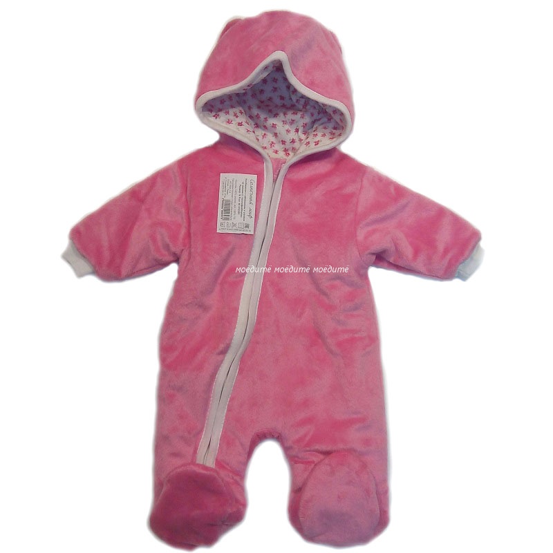Комбинезон с капюшоном декорированный ушками, с закрытыми ножками, с рукавчиками на манжетиках, спереди на молнии до конца одной ножки.