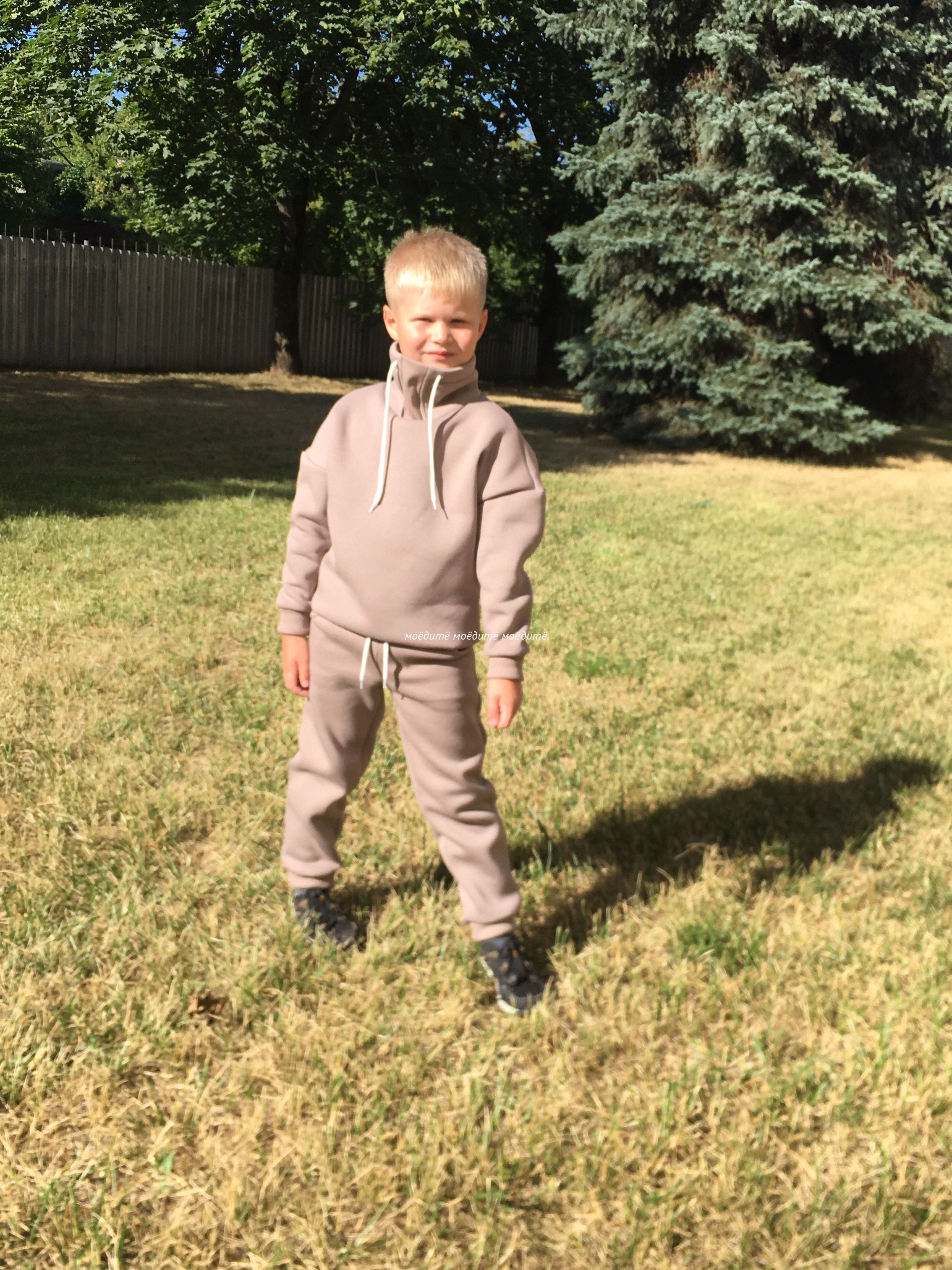 Костюм выполнен из футера 3-хнитки с начёсом. Состоит из свитшота и брюк. Брюки сверху на широкой резинке и со шнурком, снизу на манжете с отворотом. Свитшот с воротником-стойкой, украшен шнурком, снизу вставлена резинка, рукава на манжетах с отворотом.