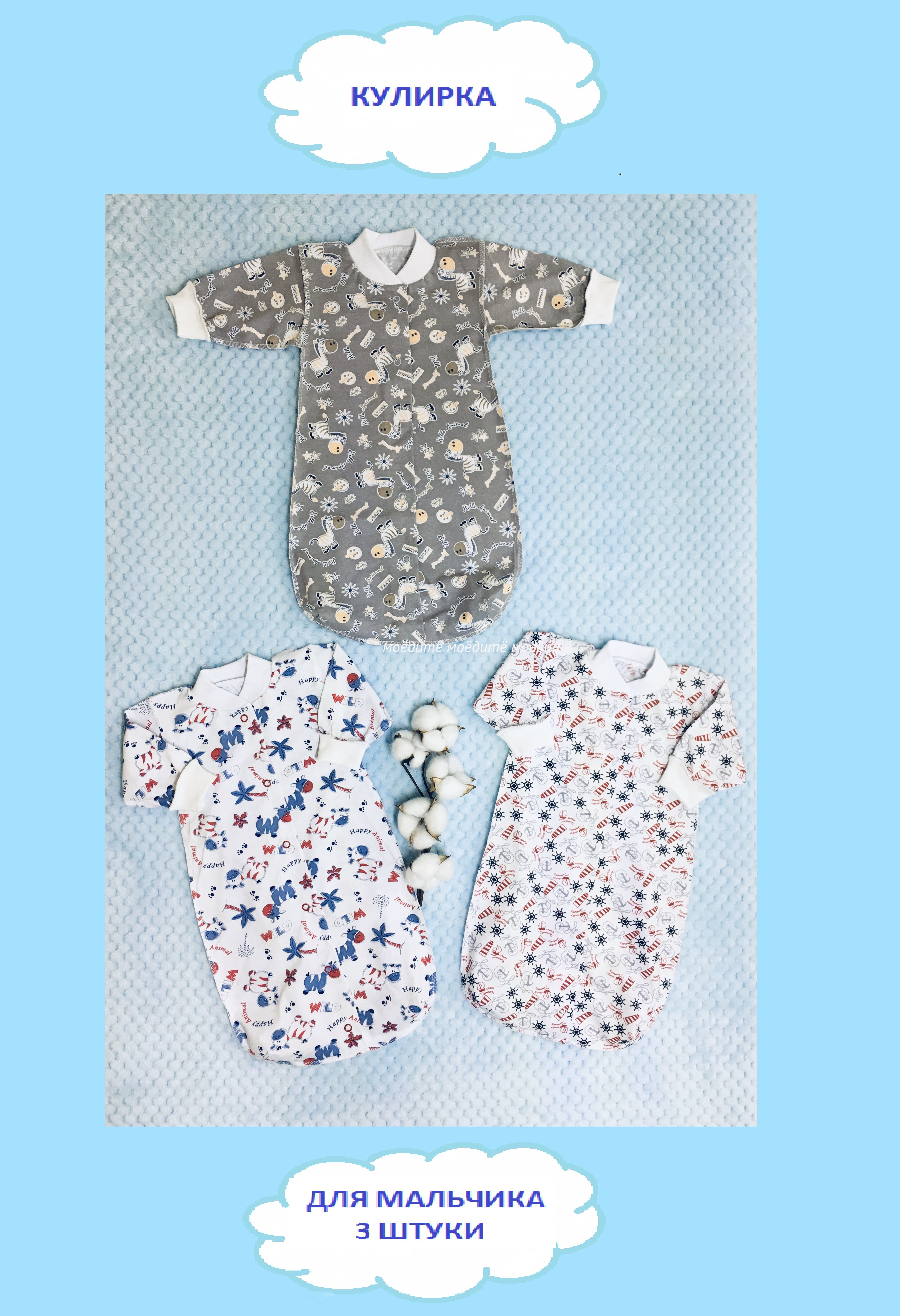 Мешочек выполнен из 100% хлопка (кулирка). Мешочек с длинным рукавом на манжете, спереди на кнопочках.
